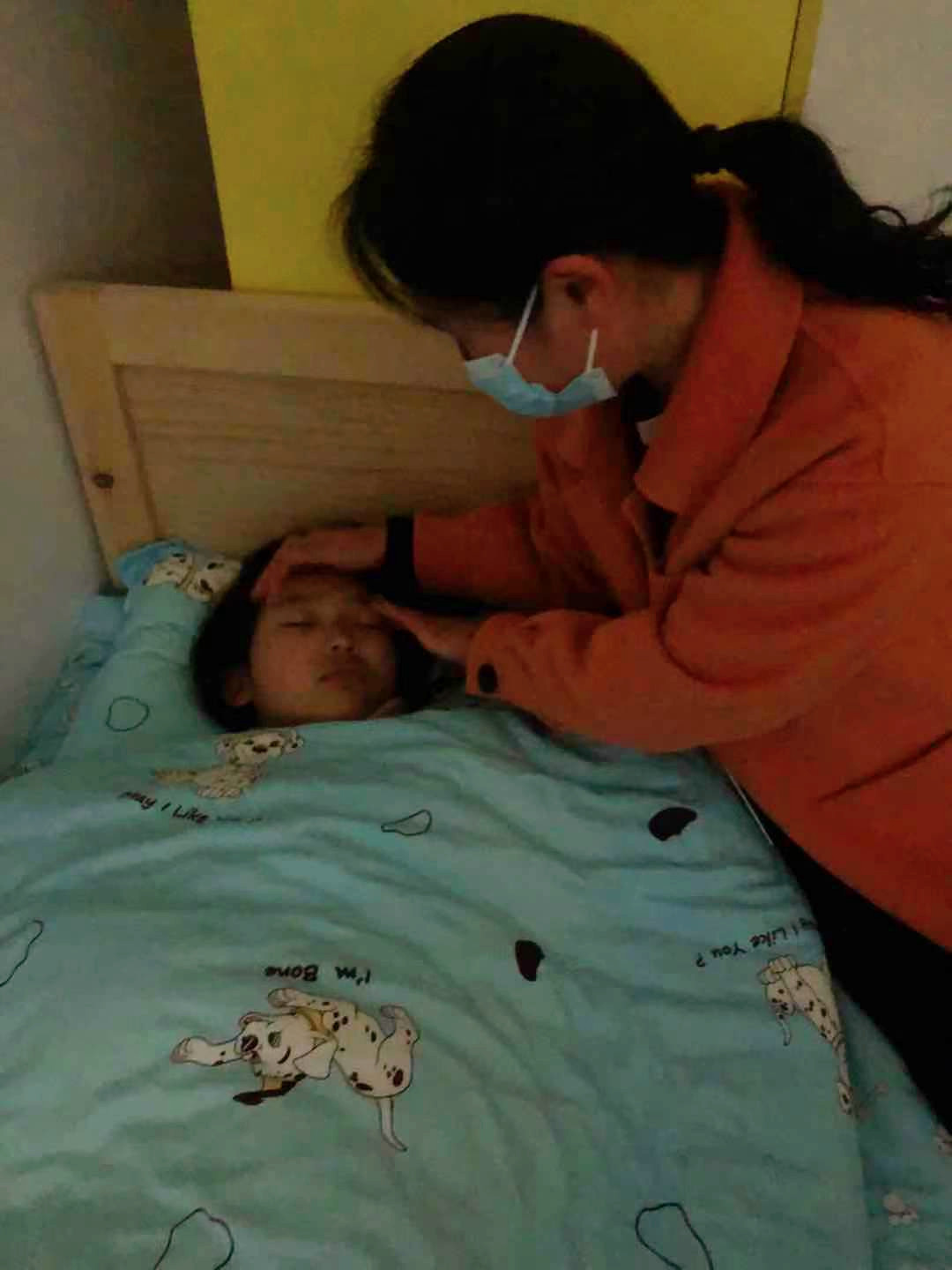 凌晨一点二十分,公寓部姜老师反映女生322号寝室卞紫萱高烧39°C,浑身发抖。姜老师见孩子情况严重,马上联系夜班施老师一起搀扶卞紫萱去医务室吃药。回到寝室后,施老师在卞紫萱身边护理一个多小时,直到凌晨三点,卞紫萱的状态才有所好转。“施妈妈,我有点头疼。”“没事宝贝儿,施妈妈在这呢,我给你按摩按摩就舒服了。”随后施老师一直帮卞紫萱按摩头部,在施妈妈的照顾下,三点半孩子慢慢进入了梦乡。早晨四点半左右,施老师再次给孩子量体温,体温计显示37.7°C,温度降低。“施妈妈,您休息会吧。”“我不累,你好好休息,一会再把药吃了,咱们的病就好了。”施老师温柔的答道。早晨五点三十分,施老师给卞紫萱拿来布洛芬混悬液进行口服,与此同时公寓部姜老师也为孩子打来了早餐。早晨六点十分,施老师再次来到医务室拿着退热贴向卞紫萱的寝室跑去,六点十五测量体温,温度计显示37°C。此时一夜未眠的施老师终于送了一口气,施老师看着卞紫萱有了精神状态,自己也会心一笑。